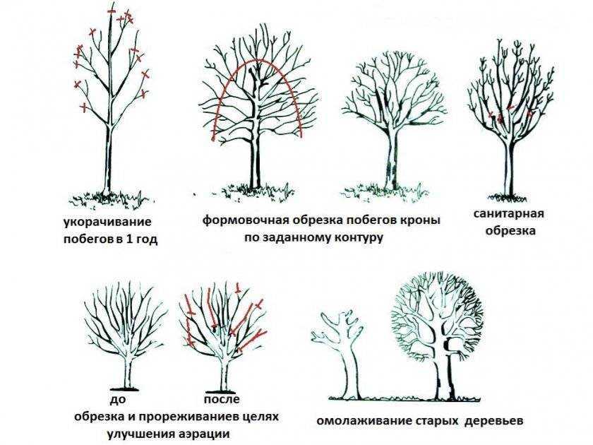 При обрезке следят за соподчиненностью всех ярусов, регулируют высоту дерева, удаляют ветки-конкуренты. В результате получается гармоничная крона с ветвями, получающими максимальную освещённость.