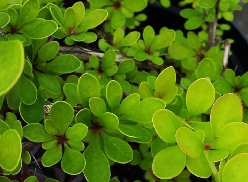 Невысокое растение (80 см) при диаметре кроны 1 м с жёлтыми яйцевидными листьями, красно-жёлтыми цветками и бордовыми ягодами.