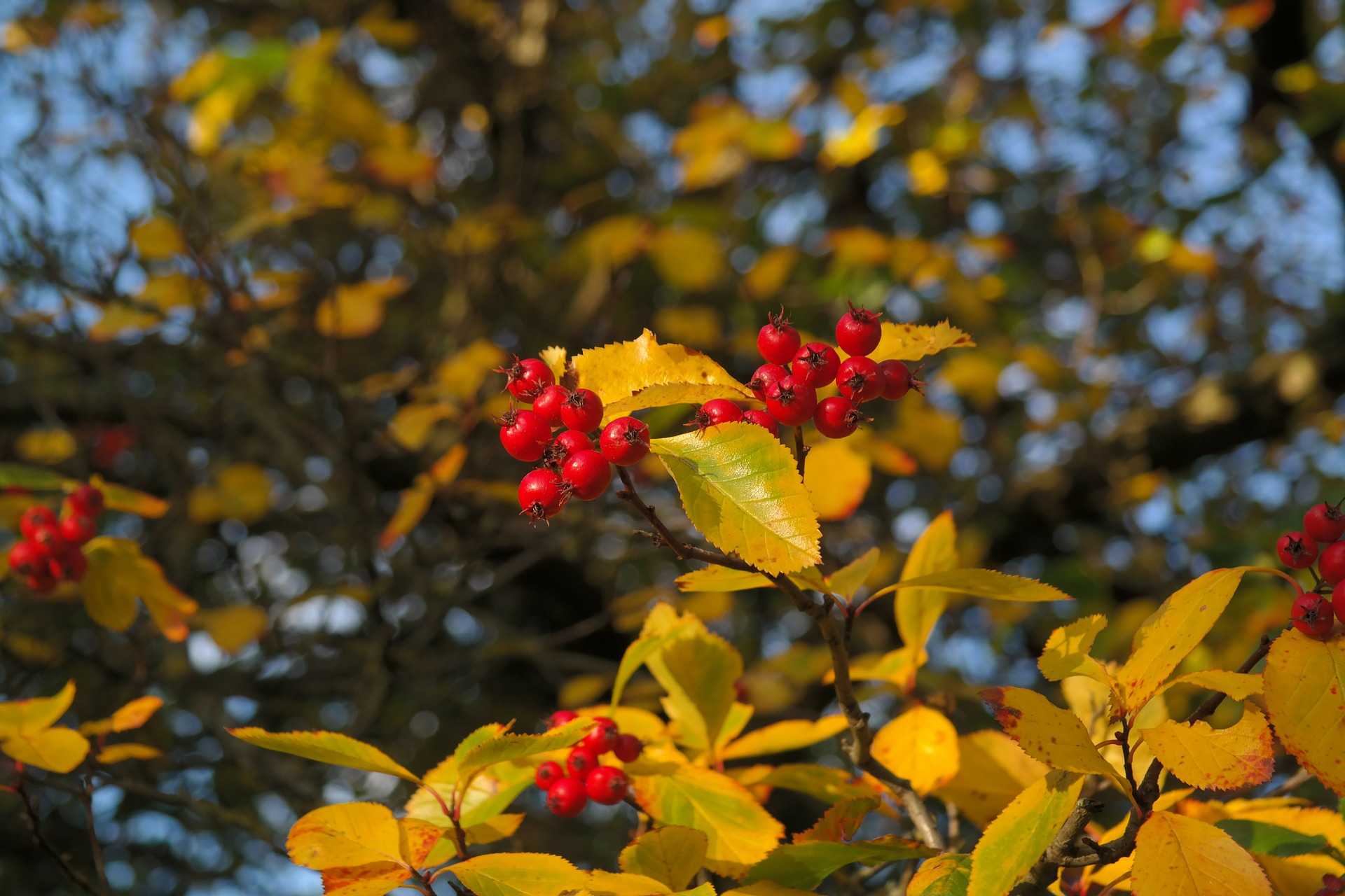 - Изящные листья боярышника, темно-зеленые летом и красно-оранжевые осенью, могут быть как цельными, так и рассеченными.