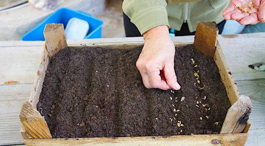 В ящиках. Для этого на дно контейнера помещают дренаж в виде гальки, слой песка и сверху насыпают слой почвы. Посев осуществляют по схеме 4×4