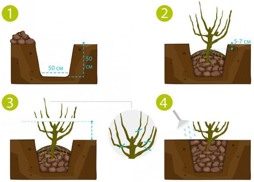 Лунки нужно выкопать за неделю до посадки. Располагают их на расстоянии 1,5 м друг от друга. Между рядами оставляют шаг 2–2,5 м. Размер ям 40×50×50 см. Верхние 20 см почвы из каждой лунки смешивают с 10 кг компоста и 20 г суперфосфата. Плодородным субстратом заполняют углубление на 1/3, заливают 10 л воды.