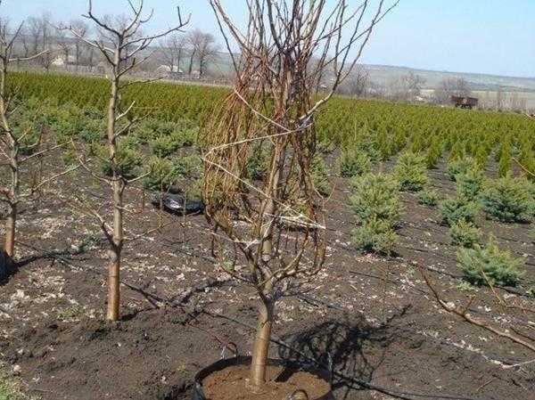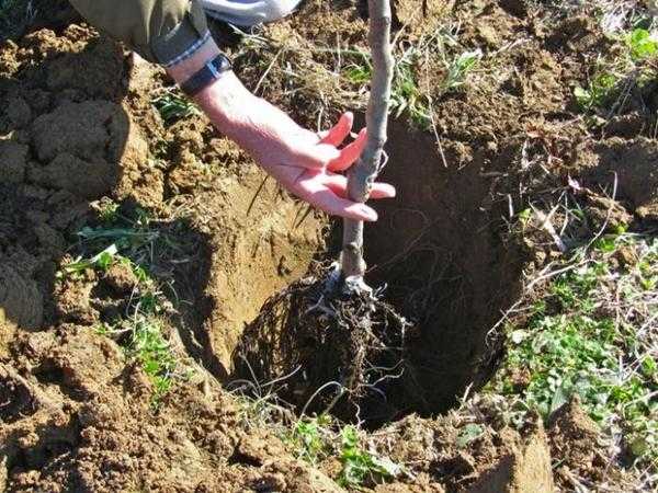 Высаживать на садовом участке следует двухлетние саженцы, более взрослые растения будут хуже адаптироваться на новом месте, могут долго болеть.Корневая система деревьев не должна иметь видимых повреждений, следов болезней. Ствол саженца должен быть ровным и гладким, без наростов и повреждений.(yaads =Глубина посадочной ямы должна быть 1,0 м, а диаметр – 0,37 м. На дно ямы помещают слой питательного субстрата, состоящего из садовой земли, компоста и минеральных удобрений. В центре ямы из почвосмеси делают холм, на который устанавливается саженец. Рядом с ним в почву вбивается колышек, к которому будет привязано молодое деревце.