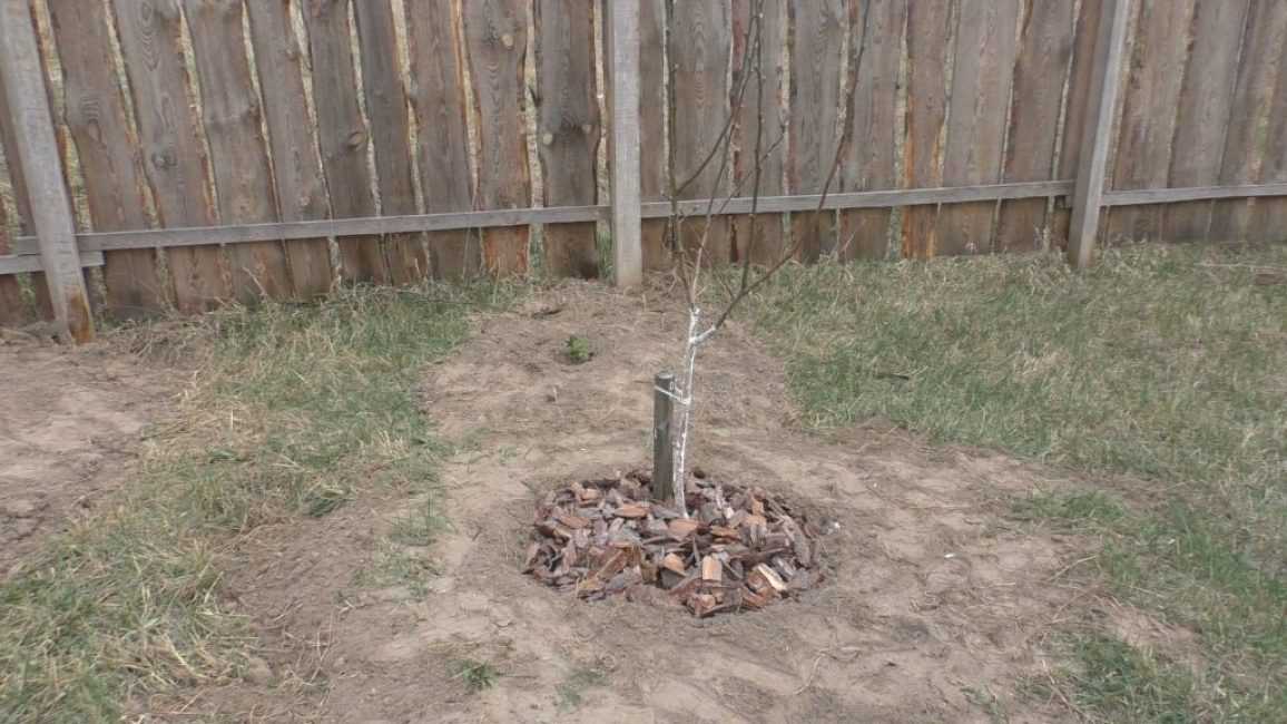 Завершительный этап – мульчирование и фиксация ствола к опоре (не пережимать!). Землю внутри земляного валика можно замульчировать тем, что есть под рукой.