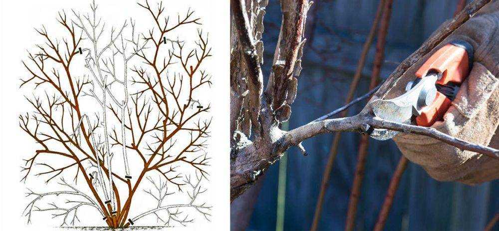 Кроме обрезки для формирования кроны проводят и санитарную процедуру. Для этого удаляют сломанные, сухие и загущающие растение побеги, то есть растущие внутрь куста ветви. Обязательно борются с корневой порослью. Для омоложения старого кустарника его обрезают, как говорится, «под пенек».