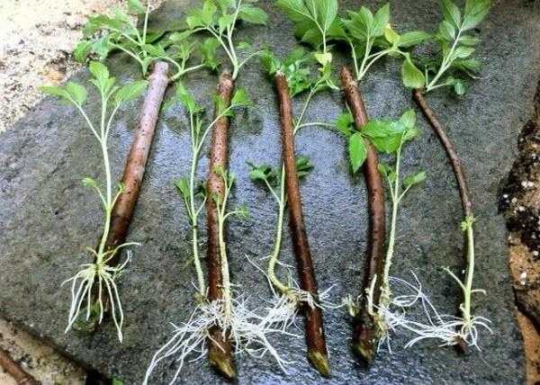 Побеги высаживают на заранее удобренный участок и регулярно поливают. Через месяц у черенка появляется крепкая корневая система