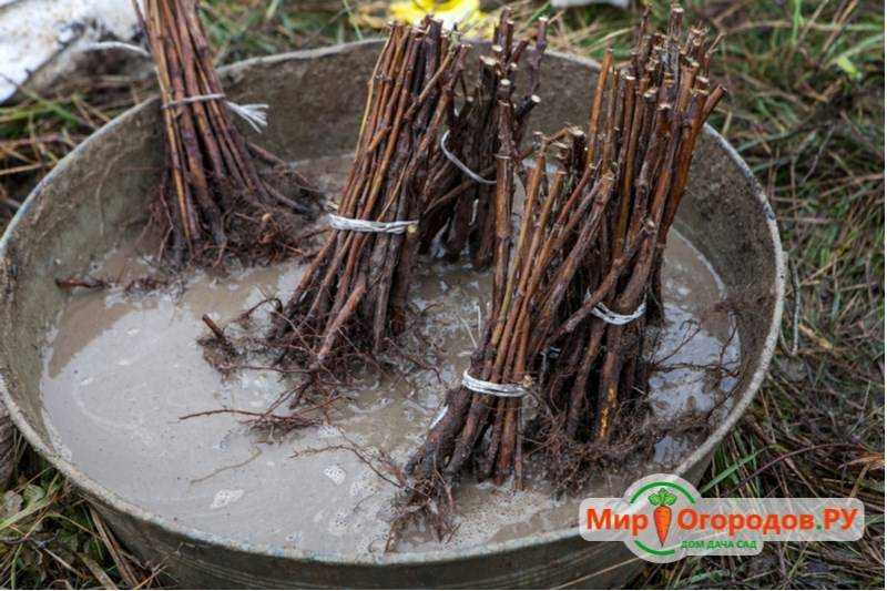 Cаженцы малины, вымоченные в специальной смеси перед посадкой