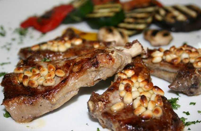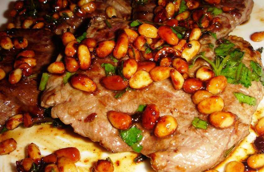 - Петрушку промыть и измельчить. Свинину и зелень переложить в сковороду и доготавливать ещё 2-3 минуты, интенсивно поливая мясо кедровым соусом.