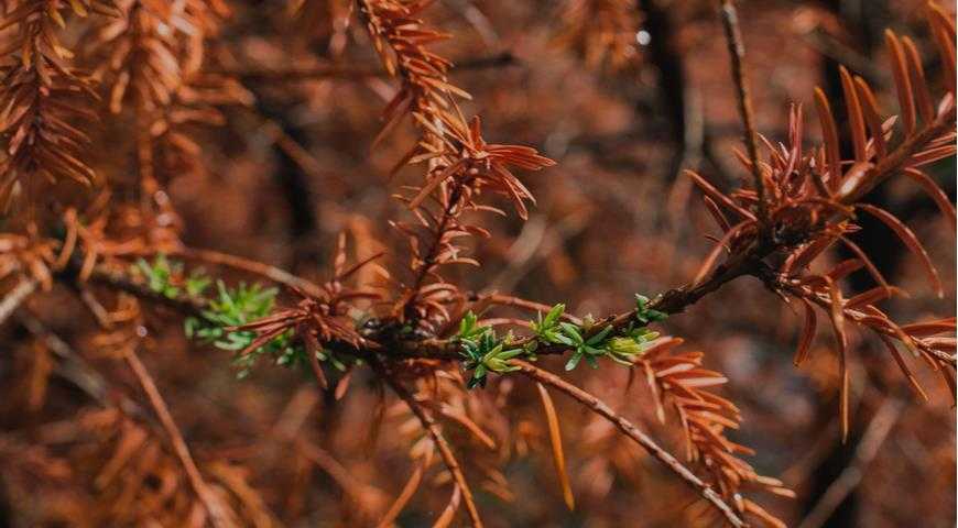 - Сбрасывание хвои на зиму помогает растению обезопасить себя от пересыхания, которое угрожает многим хвойным при промерзании почвы;