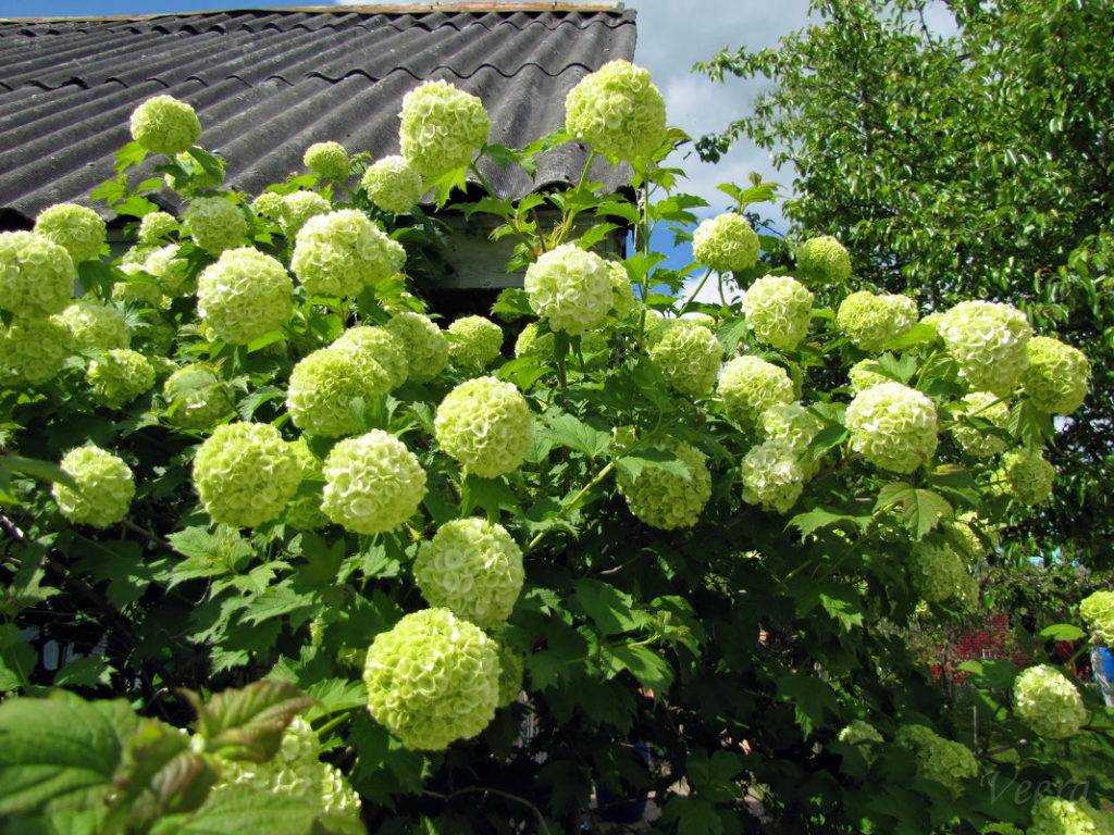Очень красивый декоративный сорт калины, ягод не дает, соцветия шаровидные, пышные, цветы в начале зеленоватые, после белые, к концу цветения слегка розовеют.