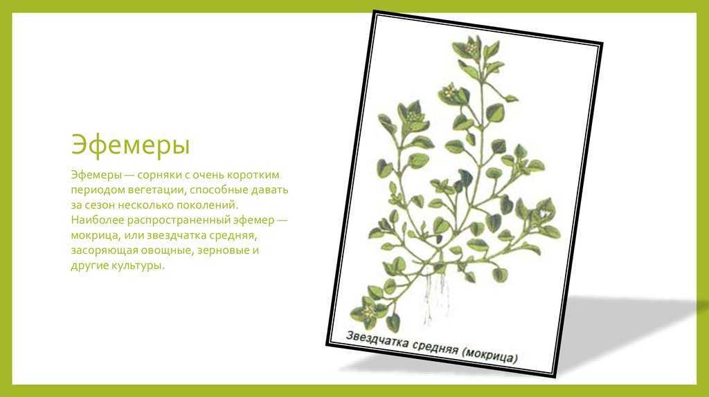 - Эфемеры. У них вегетационный цикл менее сезона, прорастают ранней весной.