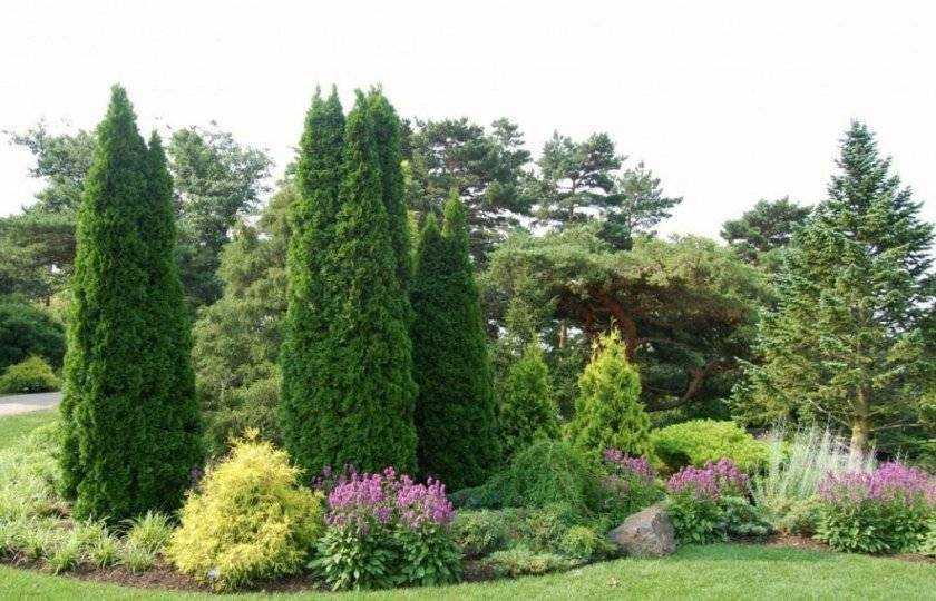Низкорослые сорта выигрышно смотрятся с пышными кустами – спиреей, декоративным барбарисом, бузиной, на альпийских горках и в рокариях. Карликовые разновидности выбирают для создания композиции с деревьями. Плакучий кипарисовик высаживают над водоемом, создавая живописный пейзаж.