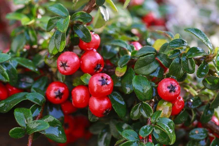 — Кизильник Даммера. Низкорослый кустарник, высота всего лишь 10 сантиметров. Ветви склоняются в стороны, имеет яркие, красные плоды.