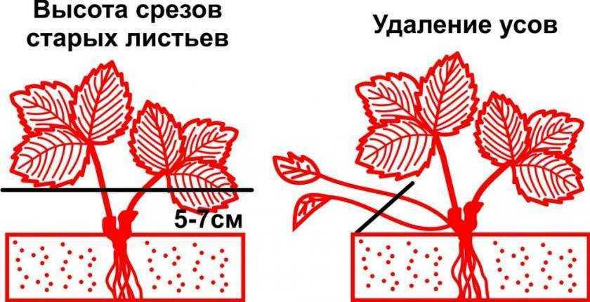 Чтобы получить крупные ягодки, нужно постоянно обрывать растущие усы. Для подготовки посадки этой ягоды к зиме проводят обрезку больных и засохших листьев, а также усов. В холодный период основная часть листвы засохнет, поэтому весной её нужно будет удалить, почистить грядки от опавших листьев и разного мусора. Данную процедуру проводят, когда полностью уйдут заморозки, так как старая листва хорошо защищает растение от холодов.