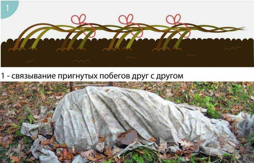 Оставшиеся на кусте побеги нужно пригнуть к земле, зафиксировать проволочными скобами и накрыть еловыми ветками или специальным материалом — агроволокном. Теперь, подкормленные, напоенные и укрытые, кустарники впадут в состояние покоя и хорошо перезимуют.