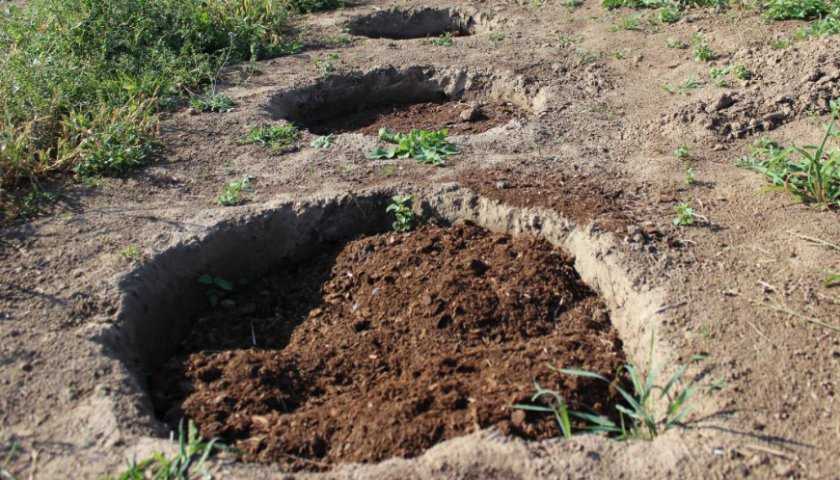 Размер ямы зависит от сорта. Для низкорослых выкапывают – 0,6 х0,6 м, глубиной 0,4 м, для крупных 0,8 х 0,8 м на 0,6 м. Извлеченный грунт используют для других растений. Боковые стенки выстилают разделительным материалом, чтобы при поливе не вымывались нужные вещества за пределы ямы.