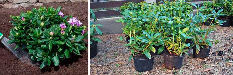 горшок водой, затем вынуть саженец и развернуть, растянуть у него корни. Если этого не сделать, саженец будет долго «сидеть на одном месте», не трогаясь в рост, и даже может погибнуть.Растение надо посадить на ту же глубину, как оно находилось в горшке. При посадке почву не уплотнять, всю работу можно делать руками, без лопаты. После посадки необходимо мульчирование хвойной подстилкой из соснового леса. Не стоит пользоваться подстилкой из елового леса, она отрицательно влияет на развитие рододендронов.