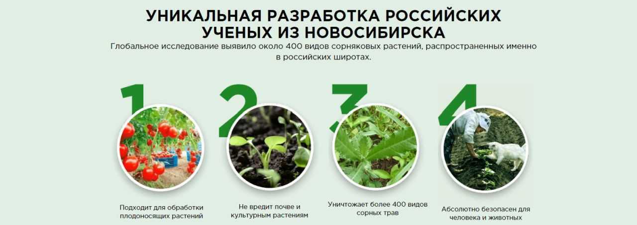 Содержание действующего вещества в высокой концентрации позволяет уничтожить даже самые живучие сорняки, которые не поддаются выведению механическими и агротехническими способами.