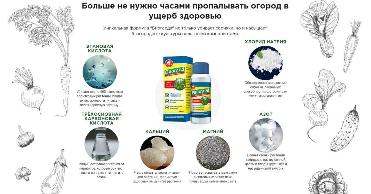 Предлагаемое средство Биогард, по утверждениям специалистов, не только борется с сорняками и уничтожает вредителей, но совершенно безопасно для культурных растений и человека, что подтверждают реальные отзывы.
