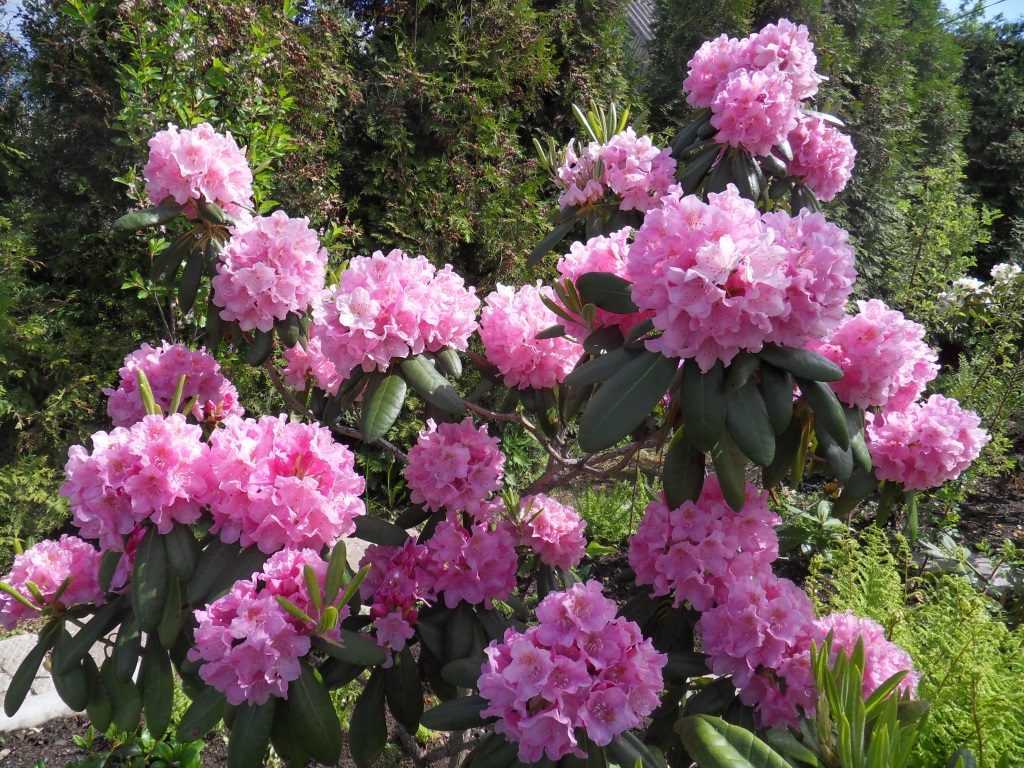 Среди сортов садового рододендрона выделяется Элеганс с темно-зелеными листьями и розовыми соцветиями. Морозоустойчивый, вырастает до 3 метров.
