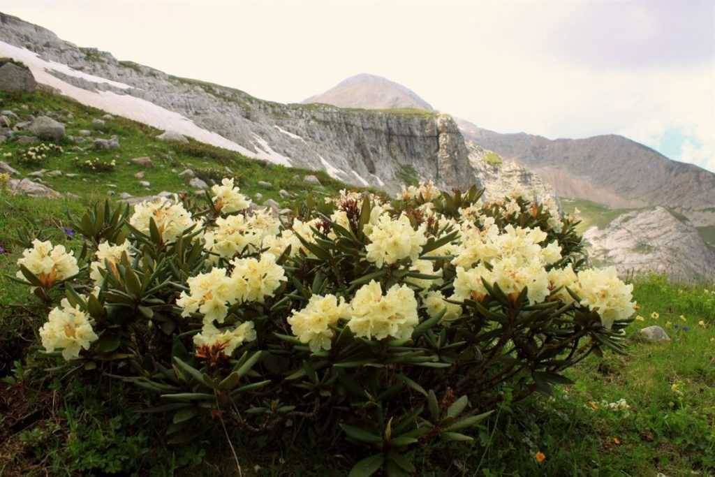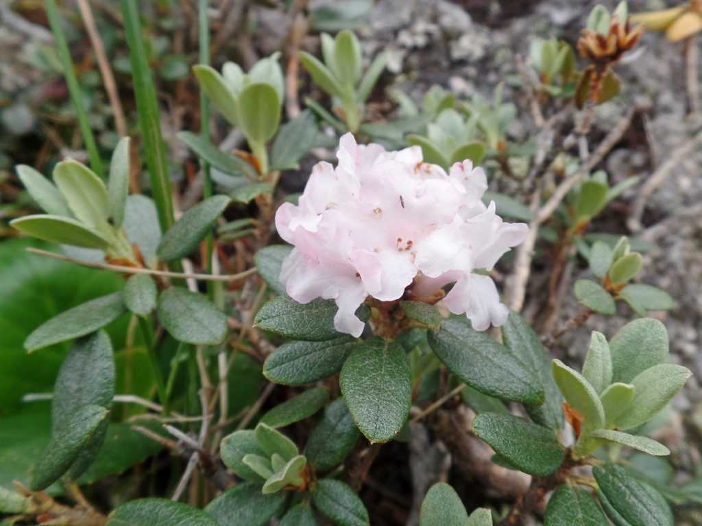 Рододендрон вечнозеленый Кавказский обитает в предгорьях Кавказа. Относится к стелющимся видам. Кисти состоят из 8 – 10 колокольчиков, собранных в соцветие. По окрасу может быть бледно-розовым, темно-розовым, бледно-желтым или золотисто-желтым.