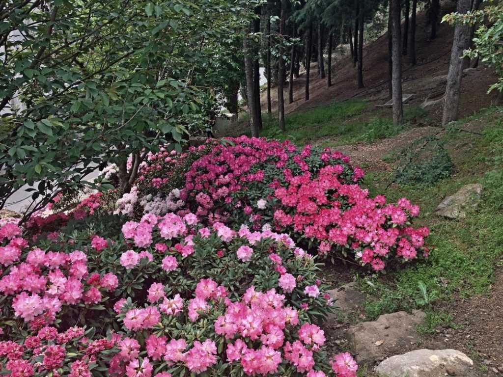 Рододендрон Ледебура эффектно смотрится на фоне хвойных деревьев — никакое описание не будет достаточным. Это нужно только видеть. Для нижнего декоративного уровня берут злаковые и просто многолетние травы