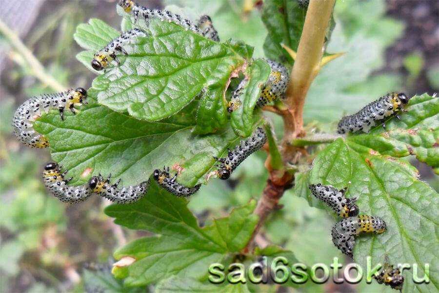 Бледноногий пилильщик полностью черный со светлыми пятнами. Вредители питаются ягодами крыжовника, черной и красной смородины.