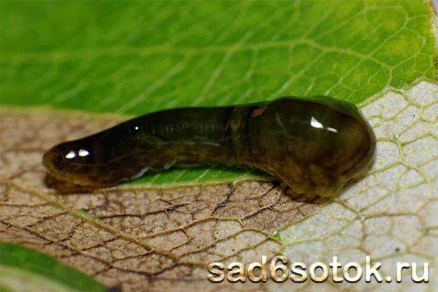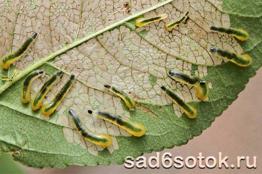 Личинки вредителя желто-зеленые до 11 мм в длину с черной головой, покрытой слизью. Вишневый пилильщик повреждает вишню, черешню, грушу, рябину, яблоню, айву.