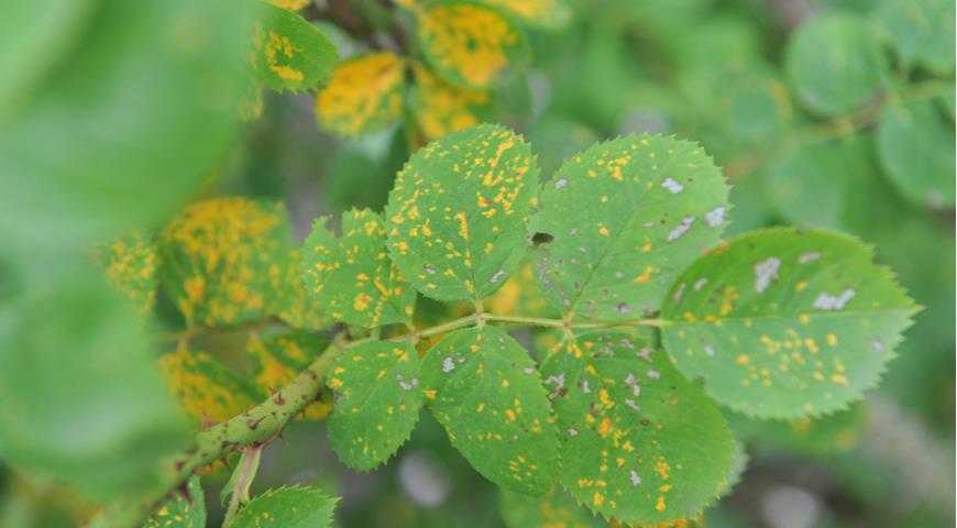 Опаснейшее заболевание, настоящий бич европейских садов. На листьях появляются ярко-оранжевые пятна. По мере развития заболевания их количество увеличивается, они чернеют, а с изнанки становятся ржаво-бурыми. Всё это приводит к язвам на побегах. При сильном поражении роза может погибнуть.