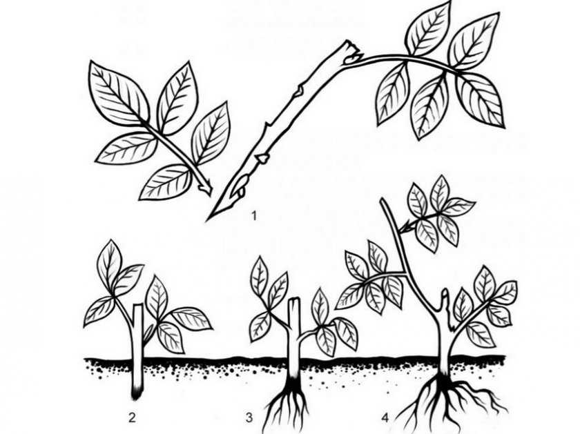 Размножение шиповника черенками: 1 — нарезка черенка; 2 — черенок в момент посадки; 3 — черенок через 4 недели после укоренения; 4 — новое растение.