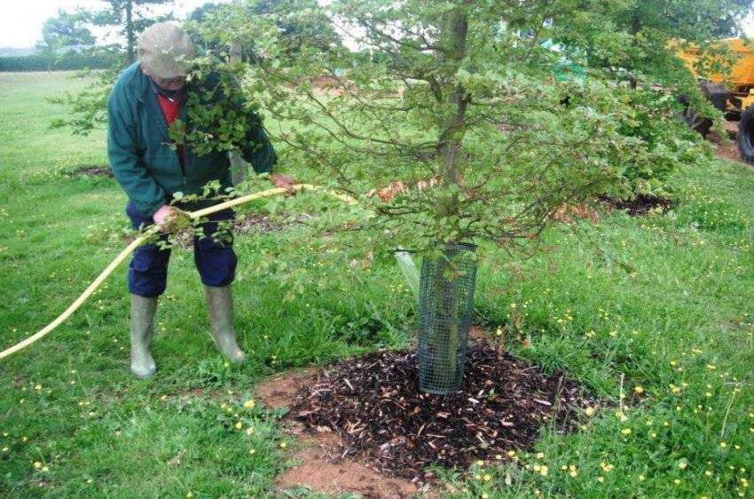 Обязательно поливайте молодые деревья каждую неделю в течение первого вегетационного периода. Это способствует росту. Начиная со второго года поливать можно чуть реже — 1 раз в 2 недели. Полив делают глубоким. Но после него грунт должен успевать просохнуть, хотя и не полностью. Полив начинают с весны и продолжают до середины октября, чтобы увлажнить почву и дать дереву влагу перед зимним периодом.