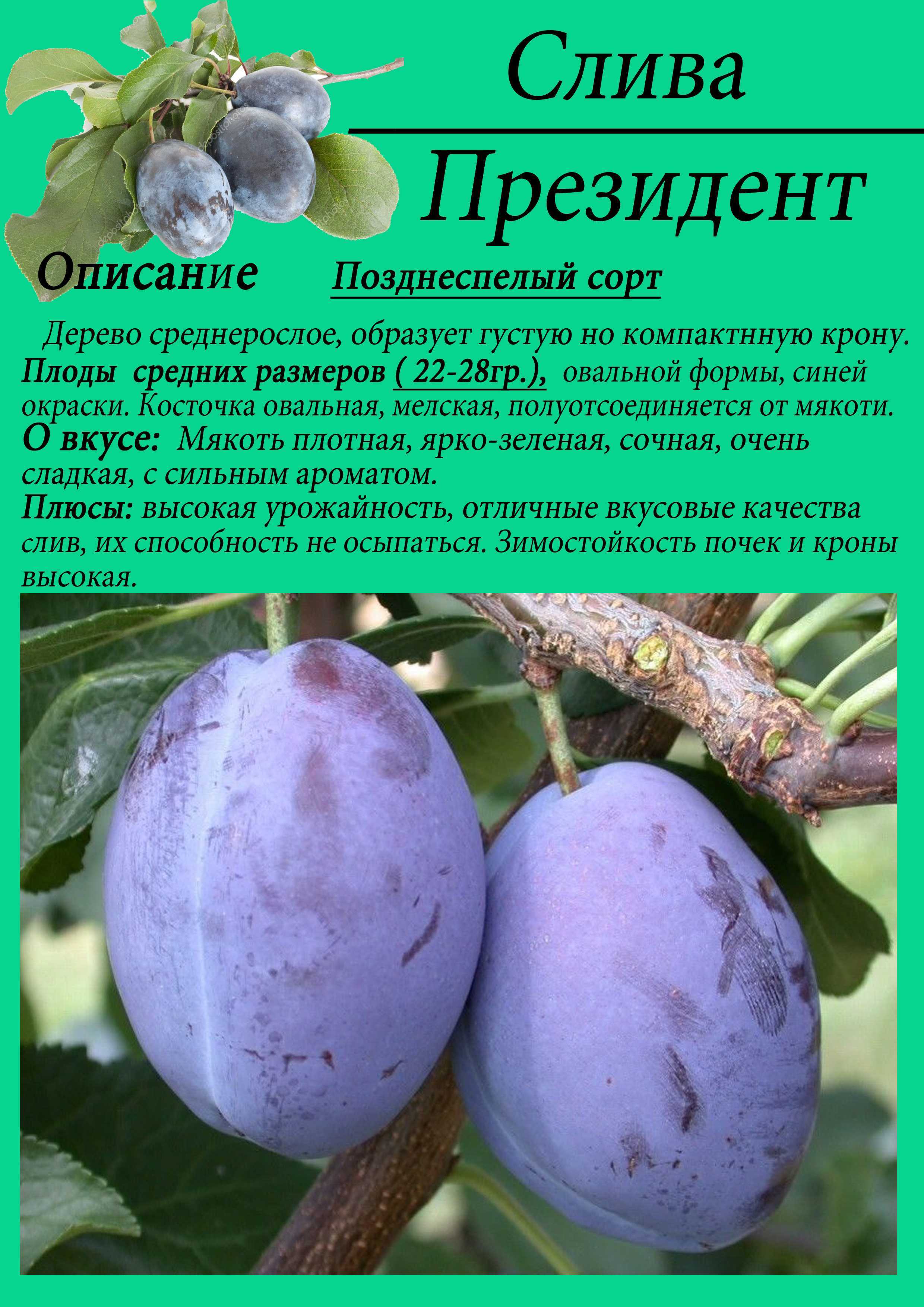 - Растение средней высоты. Сорт получен скрещиванием сливы Президент с Чачакской наибольшей.