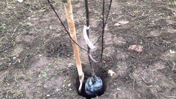 Земля для посадки мешается из грунта, полученного при выкапывании ямы, 1 ведра компоста или перегноя, 150 г суперфосфата и такого же количества сульфата калия. На дно ямы необходимо вбить колышек для подвязки. Он должен быть не в центре, а примерно на 25 см от него или даже дальше, чтобы не мешал дереву расти