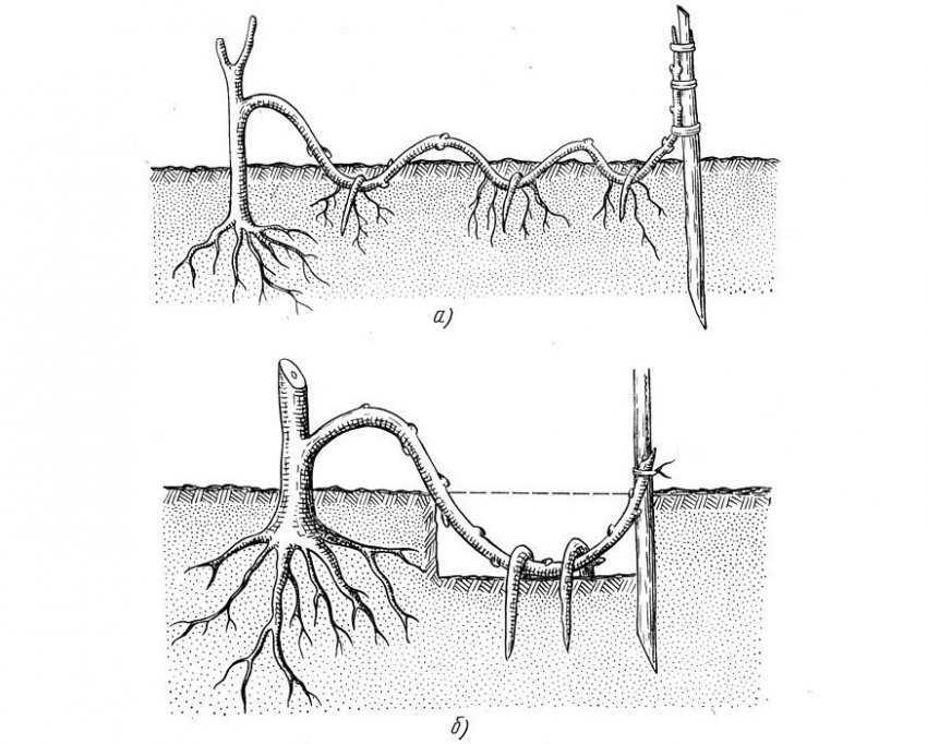 Отведение побегов: а — в ямки змейкой, б — в канавки