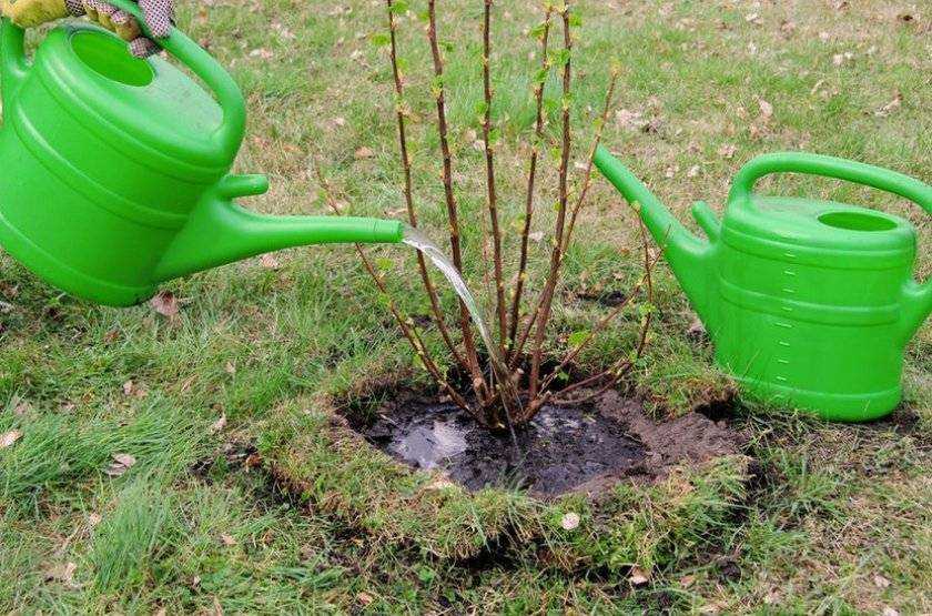 Если лето выдалось жарким и без осадков, увлажнение проводят каждые 10 суток. Под 1 взрослый куст льют 3–6 вёдер. В период проливных дождей полив прекращают. Для удобства орошения формируют приствольный круг с бортиками для удержания влаги. Осенью до морозов также проводят обильный полив, чтобы подготовить растительную культуру к зимнему периоду.