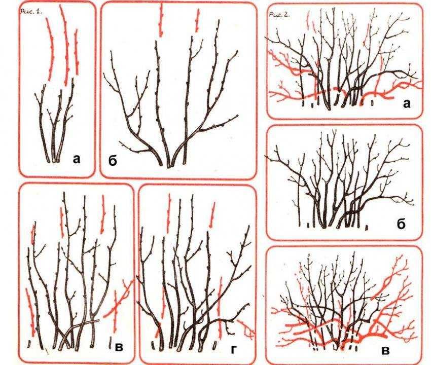 Обрезка смородины: а – однолетнего саженца; б – двулетнего куста; в,г – укорачивание побегов. Рис.2. Куст смородины до омолаживающей обрезки (а), после неё (б) и обрезка запущенного куста (в).