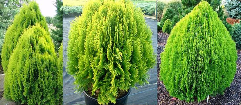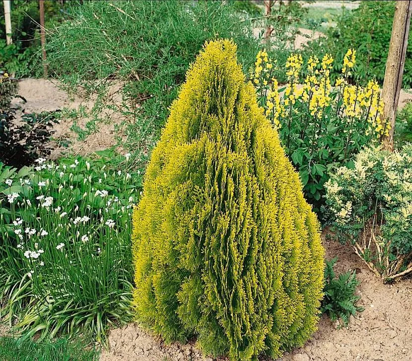 - Смарагд Витбонт — один из самых медленно растущих сортов туи, который идеален для создания живых изгородей, крона высотой 2 м пирамидальная, зелено-кремового цвета;