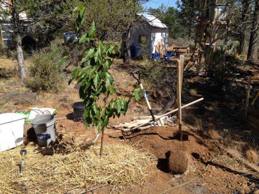 - Сверху на удобренный слой выкладывают саженец и забивают для устойчивости палку. Она засыпается плодородным слоем почвы и разравнивают. Вокруг приствольного круга делают траншеи и обильно поливают.