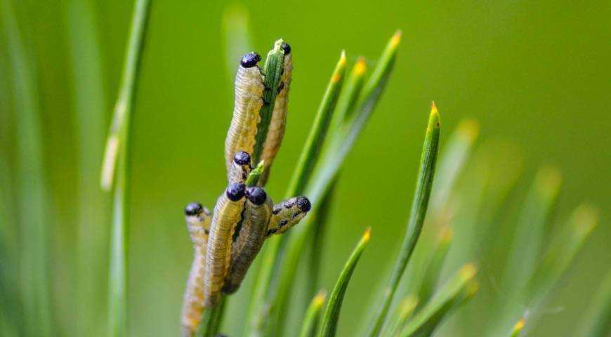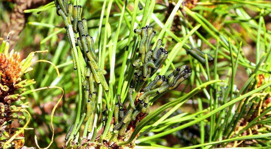 Хвоя в кроне сосны обглодана, часть хвоинок усохла, на ветках висят гроздьями коричневые гранулы и ползают вредители, похожие на гусениц — это типичная картина сосны, на которую напал сосновый пилильщик.