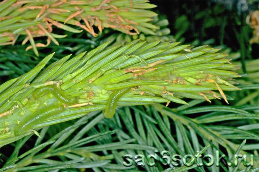 Вредитель обгрызает хвою на молодом приросте елей. Не съеденные остатки желтеют, и дерево из-за ежегодного повреждения слабеет.