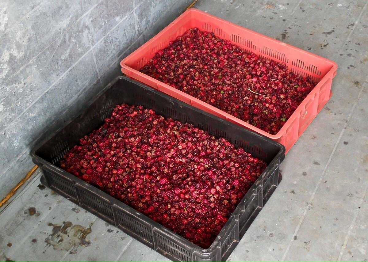 Когда куст отцветает, появляются плоды в виде сочной ягоды с косточкой. Внешне она похожа на малину, в диметре достигает 1,5 см. Вкус у полянины сладкий, схож с ананасом, многие сравнивают его со вкусом малины.
