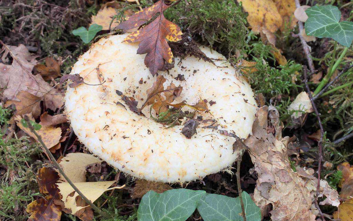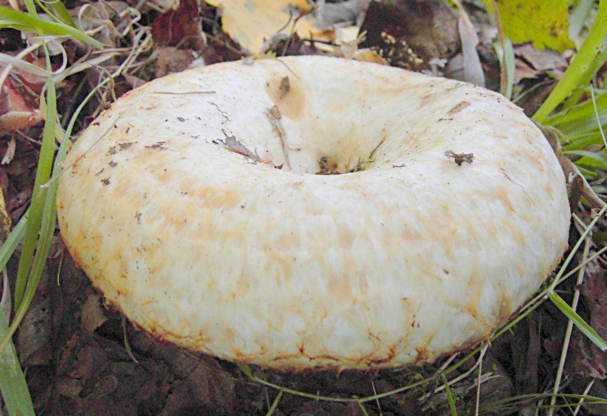 Изначально молочно-белая шляпка постепенно приобретает желтый оттенок или покрывается пятнами цвета охры. Ее края часто растрескиваются.