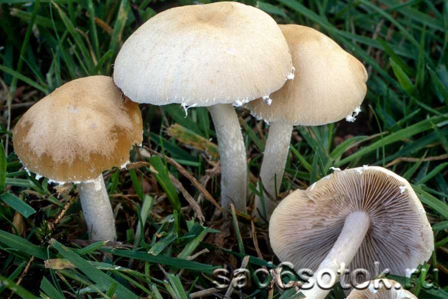 Другое название ‒ псатирелла водянистая, и по поводу ее употребления нет единого мнения – иногда гриб считается несъедобным, а в других случаях условно-съедобным. Шляпка диаметром 3–5 см, слегка выпуклая или распростертая, с потрескавшимися истонченными краями. Кожица глянцевая, коричневая, при старении светлеет от центра и становится кремовой, на краях хлопьевидные остатки покрывала. Споры буро-фиолетовые.