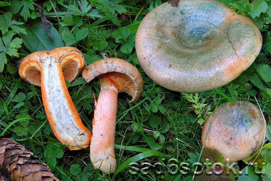 Мякоть рыжиков плотная, ярко оранжевого цвета, при надломе зеленеет.