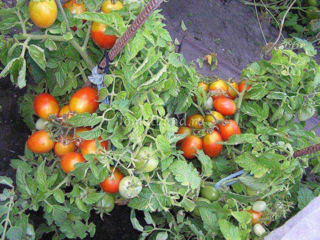 - Компактные растения, казалось бы, не должны требовать подвязывания к опоре. Но картина меняется, когда на завязях формируются плоды. Три-четыре кисти по шесть и более плодов клонят растение к земле, поэтому в период плодоношения стоит предусмотреть опору.