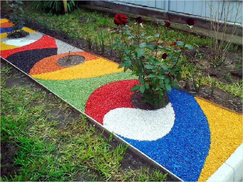 - Дорожка из цветного щебня выглядит необычно и интересно. Контрастное сочетание цветов, сложные рисунки и надписи украсят детскую площадку или зону отдыха. Щебень и гравий разных расцветок можно купить или приготовить своими руками. Инструкция по окраске очень проста: просеянные через сито камешки примерно одного размера смешивают с акриловой краской в бетономешалке в течение часа, процеживают через сито, затем сутки просушивают. При создании сложных узоров для закрепления рисунка применяют бесцветное полимерное связующее, которое выливается поверх узорчато выложенных камешков.