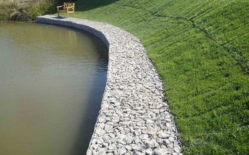 С помощью таких коробов можно не только укрепить стенки, но и декорировать водоем. Сетчатая конструкция, заполненная щебнем, отлично гармонирует с естественным оформлением водоема – кувшинками, зелеными насаждениями. Габионы позволяют не беспокоиться о подготовке дренажа, поскольку сами по себе обладают дренажными свойствами. Через год — два они становятся еще более надежной опорой для берегов, за счет заполнения пространства между щебнем песком и грунтом, а также разрастания насаждений.