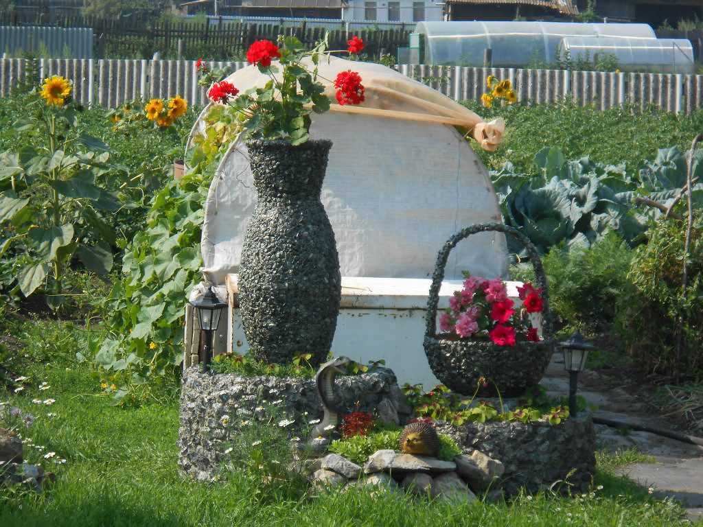 Очень интересное решение в виде сапога, в котором растут яркие цветы. Сделать такую поделку очень просто. Достаточно взять старые резиновые сапоги и залить в них раствор. В верхней части нужно установить (утопить) в бетонную смесь емкость (стакан, банку), чтобы сформировать отверстие под высадку цветов. Как только раствор засохнет, сапог срезают. Симпатичную пару «обуви» устанавливают в саду и высаживают в нее яркие культуры-однолетки.