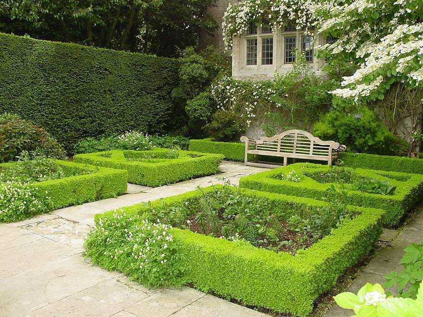 Простейший облагороженный надел имеет прямоугольную форму, разделенный дорожками на четыре ровные части. Грядки могут быть различных размеров — треугольными, трапециевидными, круглыми и т.д. Все сходятся к центральной части, на которой помещают красивый элемент — скульптуру, светильник и т.д.