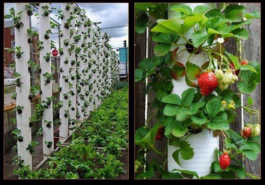 Пластиковые трубы это универсальный материал. Им вообще не нужна опора, они сами ее могут быть. В таких вертикальных грядках можно выращивать клубнику и другие ягоды.