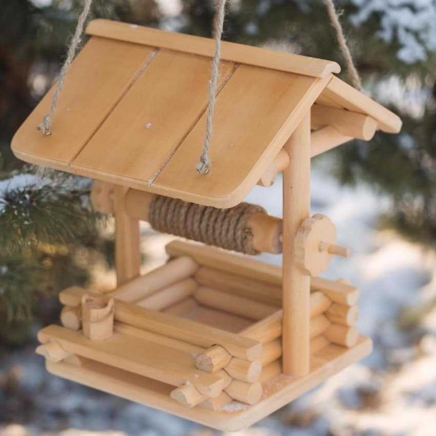 Ещё одной полезной поделкой из дерева для сада и дачи является кормушка для птиц. Вариантов дизайна для неё множество – от простых до сложных.